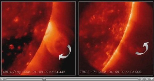 “On April 9, 2008, a coronal mass ejection or “CME” pirouetted over the sun’s limb in full view of an international fleet of spacecraft. Even veteran solar physicists were amazed.